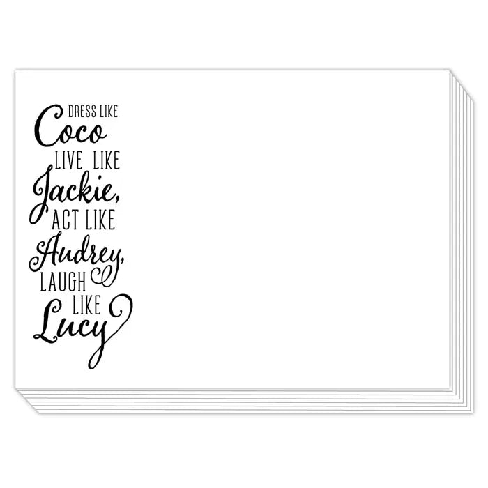 Features fun typography and quotes, tied with chevron ribbon. Typography and quotes come together to create these quirky and fun slab pads with sayings printed in black ink on white text paper, there's no holding back. Say it like you mean it. Slab pad: 8 x 6" , slab: 150 sheets, 6 x 8".